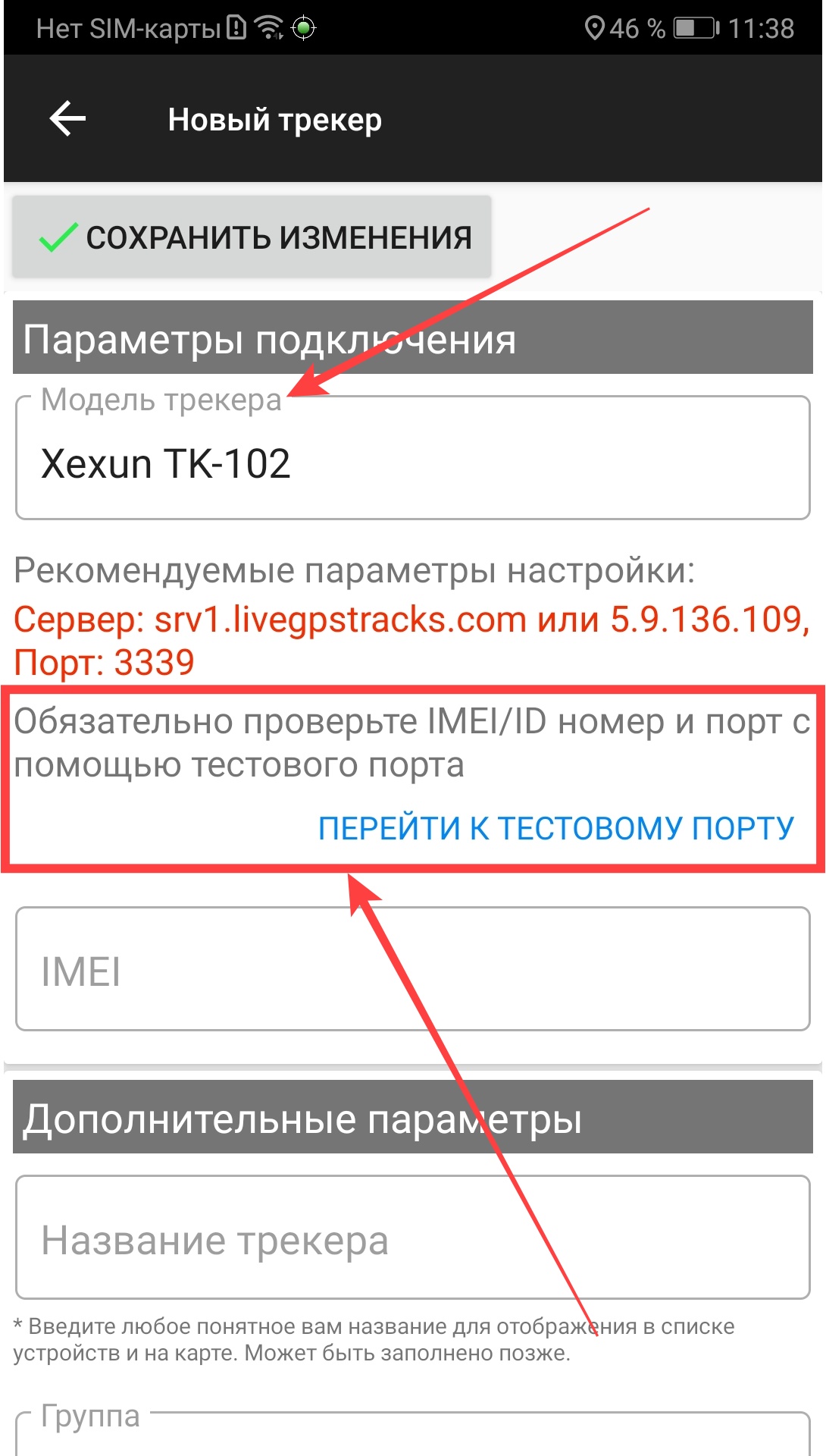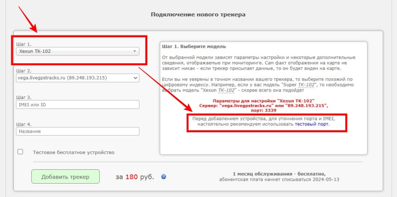 В поле "IMEI" при подключении трекера в аккаунт нужно вводить только в том виде, в каком выдал IMEI тестовый порт.