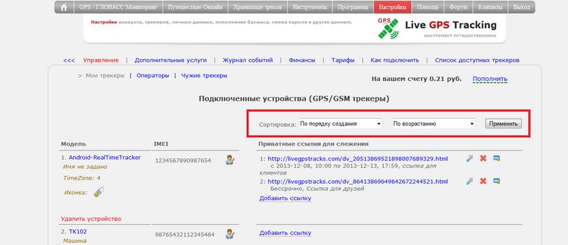 Сортировка действует как для страницы управления трекерами, так и для панели устройств на карте.