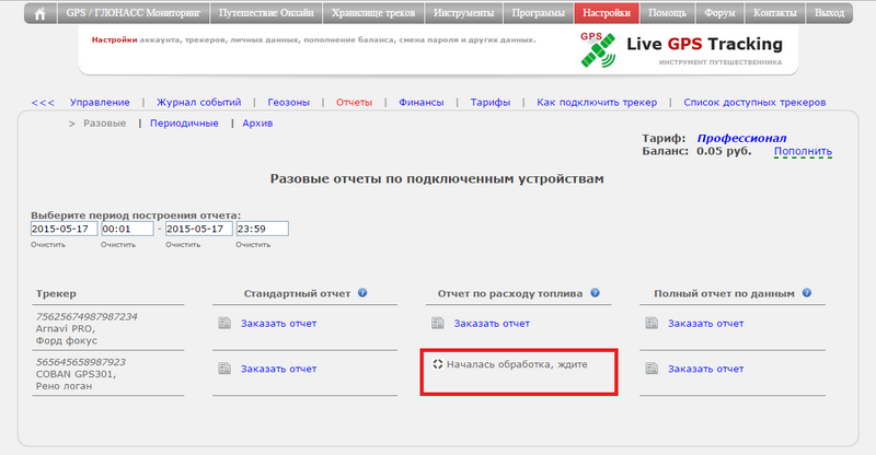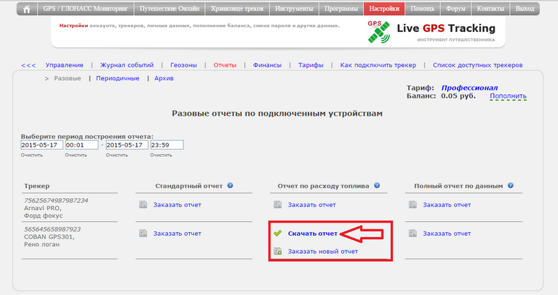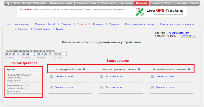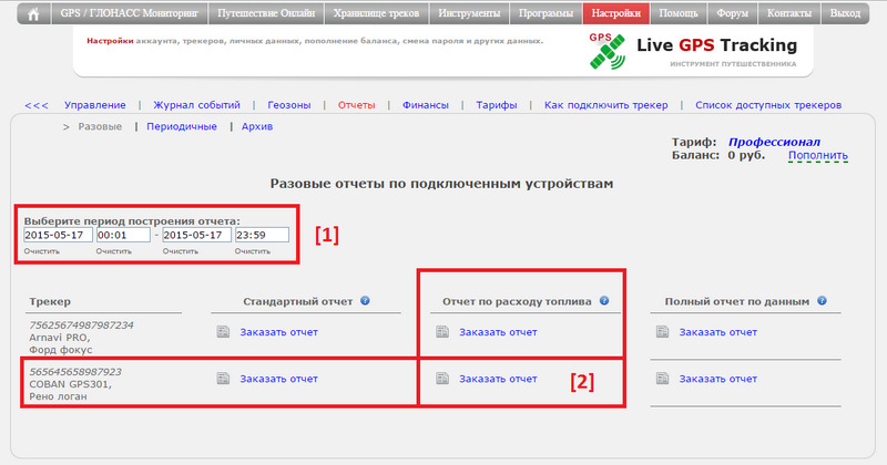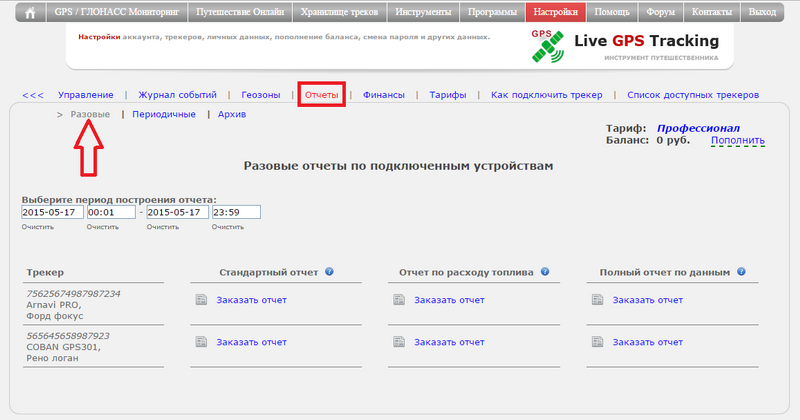 В управлении трекерами в подразделе "Отчеты" выберите пункт "Разовые"